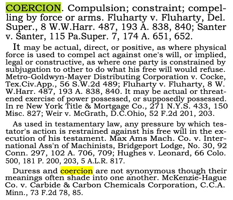 "It may be actual, direct, or positive...or implied, legal or constructive, as where one party is constrained by subjugation to other to do what his free will would refuse....It may be actual or threatened exercise of power possessed, or supposedly possessed."