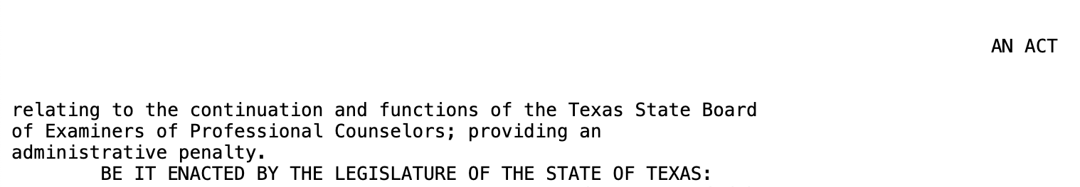 So you go back to the Texas Occupations Code, and Command+f (or Ctrl+F) to search the document. Then search, "enact" and see if you can find those words, "Be it enacted by the Legislature of the State of Texas."
